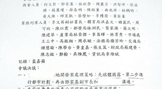 臺北市議員李新踢爆,柯文哲三月間曾針對北市某土地開發案決議“處理策略”,會議紀錄白紙黑字寫著“先媒體揭露”。(圖片來自臺媒)