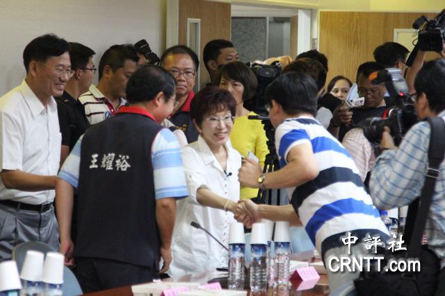 據香港中評社7月15日報道,國民黨準2016參選人、“立法院”副院長洪秀柱14日抵達國民黨高雄市黨部與地方重要干部進行座談。洪秀柱進場后一一與國民黨高雄各選區“立委”參選人握手、打氣、加油,場面熱絡!高雄共有9個 “立委”選區,共有現任立委與黨提名參選人7名到場。市議員國民黨有24席,有許昆源、黃柏霖、劉德林、唐惠美、王耀裕、陳玫娟、陳麗娜、許慧玉、陳麗珍、蔡金晏等10人出席。