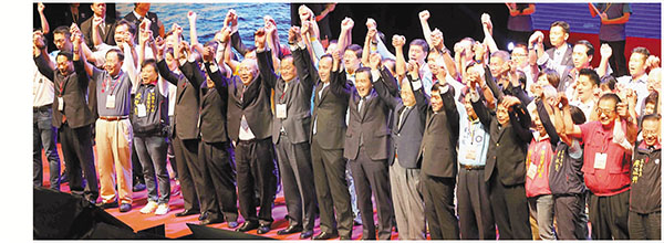 臨全會閉幕,中國國民黨全體黨代表舉手高呼團結。 圖片來源:中新社