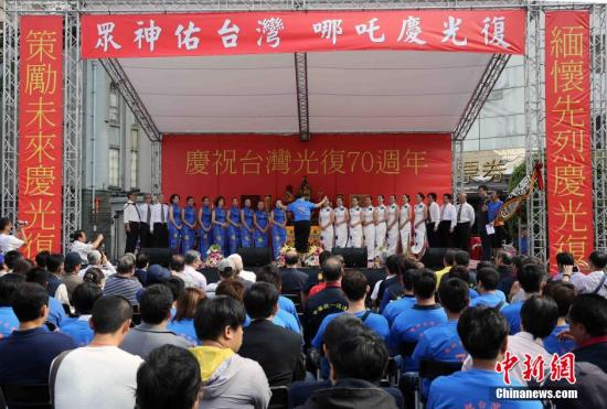 10月25日,多個民間團體在臺北中山堂、凱達格蘭大道等地舉辦慶祝臺灣光復70周年活動。其中,中華統一促進黨在中山堂廣場祭祀兩岸抗日烈士英靈,祈愿兩岸和平團圓,并結合各地民間信仰團體在傳統老城區舉辦巡游活動。(中新社記者 任海霞 攝 )