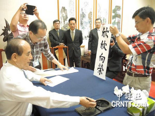 9日上午,王金平利用空閑時間揮毫寫下“欣欣向榮”四個字,當做明年春聯題字。(圖自中評社)