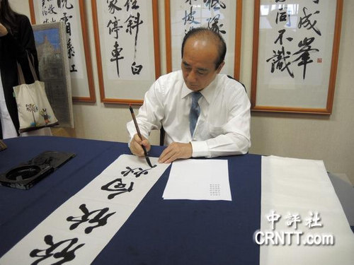 9日上午,王金平利用空閑時間揮毫寫下“欣欣向榮”四個字,當做明年春聯(lián)題字。(圖自中評社)