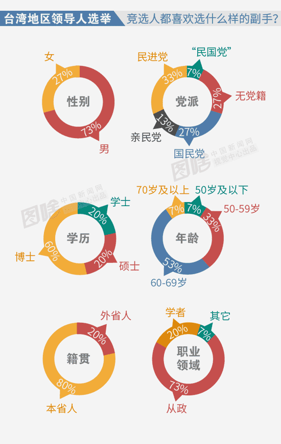 有人笑稱,沒(méi)有個(gè)博士文憑都不要意思在臺(tái)灣政壇混,從這一部分的數(shù)據(jù)來(lái)看,也的確證明此言不虛。本省人、有從政經(jīng)驗(yàn)的、60多歲的男博士成為了競(jìng)選人偏愛(ài)的副手類型。