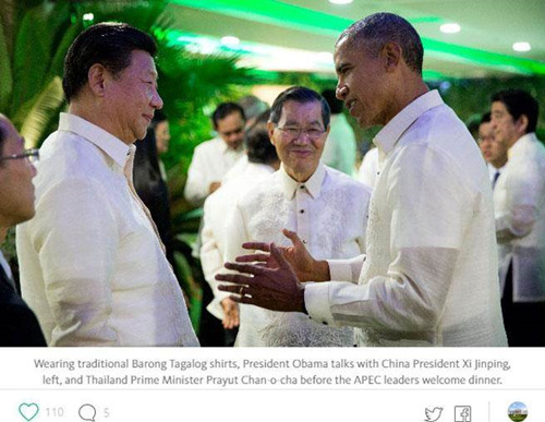 索薩的這篇文章以鏡頭后的觀察為主、描述奧巴馬與各國(guó)領(lǐng)袖私下與非正式場(chǎng)合的互動(dòng),將APEC歡迎晚宴開始前、“習(xí)奧蕭會(huì)”設(shè)為文章的主照片、放在最上方,照片中,奧巴馬與中國(guó)國(guó)家主席習(xí)近平對(duì)話,而兩人中間就是面露招牌微笑的蕭萬(wàn)長(zhǎng)。蕭也身著由鳳梨纖維制成的菲律賓國(guó)服“巴隆”,但索薩在早前的圖說(shuō)中卻寫成了“奧巴馬與習(xí)近平(左)、巴育三人在晚宴前交談”。