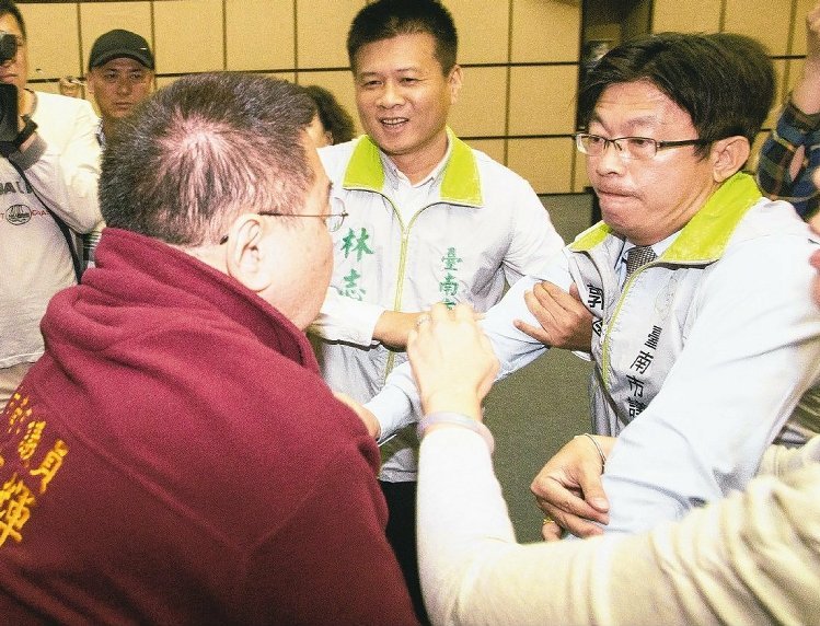 臺(tái)南市議會(huì)藍(lán)綠議員,在議事廳爆發(fā)激烈推擠。左為國民黨議員蔡育輝,右為民進(jìn)黨議員郭國文。