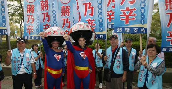 臺北市選舉委員會今天進行“立委”選舉候選人號次抽簽。國民黨“立委”參選人蔣乃辛在兩名生力軍“辛超人”陪伴下前往抽簽,特制的兩頂超大安全帽很是吸睛,要讓大安區“辛”鮮起飛。