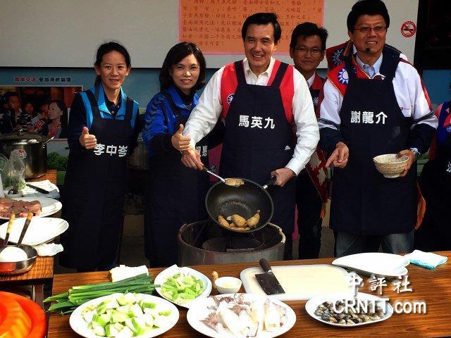 據中評社報道 馬英九10日與“臺語之神”謝龍介在臺南一起比拼廚藝,兩人穿上廚師圍裙拿起菜刀、鍋鏟,謝龍介端出一道2000年前的魯國名菜“泔轉魚”,還有象征臺灣有山有海的蚶仔菜瓜、土魠魚料理等。