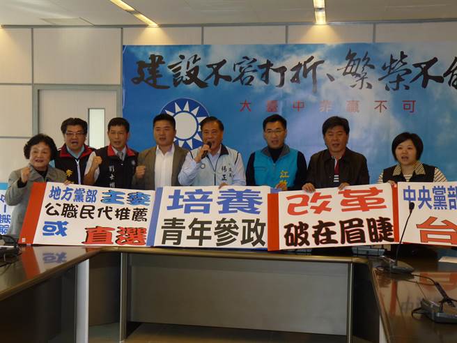 臺中市國民黨籍“立委”江啟臣(右三)、顏寬恒(左四)及臺中市議會國民黨團,今天召開記者會炮打國民黨中央,提出三大訴求。圖片來源:臺灣“中時電子報”