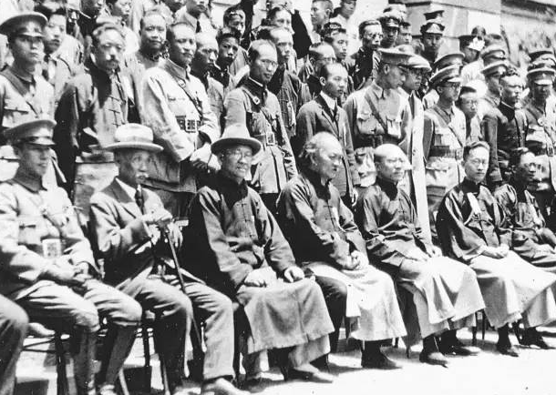 1927年4月18日,國民政府定都南京典禮。前排自左至右依次為:蔣介石、蕭佛成、鄧澤如、吳稚暉、伍朝樞、胡漢民、王寵惠。