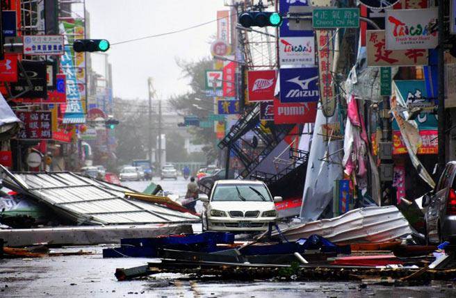 “尼伯特”臺風狂襲,臺東市鬧區有如被炸彈轟炸過的廢墟。(圖片來源:臺灣《中時電子報》)