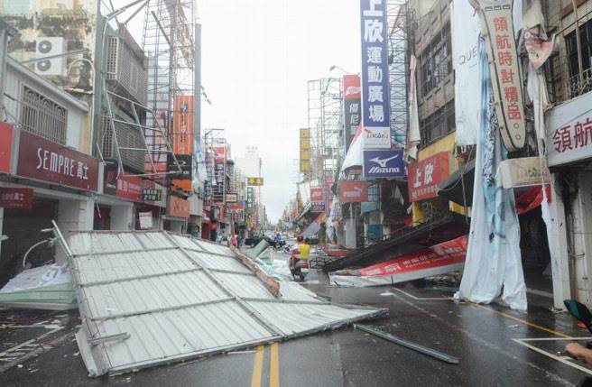 臺東市鬧區招牌掉落一地,行車要到處閃躲就像挑戰障礙賽。(圖片來源:臺灣《中時電子報》)