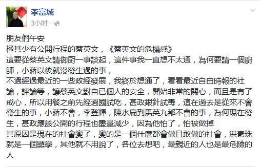 李富城在文中稱,一直想不通蔡英文為何要自費請廚子,不過經過最近的一些政經發展,才搞清楚了。李富城稱,看看最近的《自由時報》的社論、評論等,蔡英文對個人安全開始非常的關心,而且是有了戒心,所以用餐之前要先經過試吃,甚至銀針試毒。李富城稱,這在蔣經國、李登輝、陳水扁以及馬英九時代都不會發生的事情,現在發生在蔡英文時代,“因為她怕了,怕被做掉”,甚至應該公開的行程也盡量減少了。