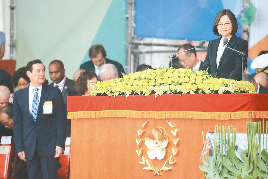 蔡英文上臺發表“雙十”談話,馬英九起身目視。(圖片來源:臺灣《聯合報》)
