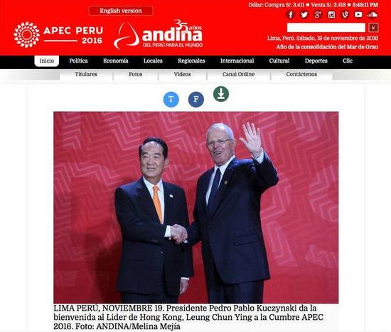 據臺灣“聯合新聞網”11月20日報道,正在秘魯舉行的亞太經濟合作會議(APEC)將于今明兩天舉行經濟領袖會議,親民黨主席宋楚瑜擔任臺方代表。他與秘魯總統(tǒng)會面的照片,卻被秘魯新聞通訊社誤指為香港特首梁振英。