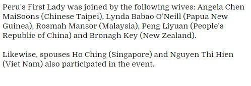 宋楚瑜女兒宋鎮(zhèn)邁陪同出席本次APEC會議,秘魯新聞通訊社又將宋鎮(zhèn)邁誤認為宋楚瑜的妻子。兩張與臺灣方面有關的新聞照片,秘魯新聞通訊社均弄錯。