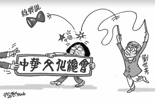 島內漫畫家以民進黨“立委”劉世芳的“扯鈴統戰說”來諷刺蔡英文當局爭奪“中華文化總會”的主導權。