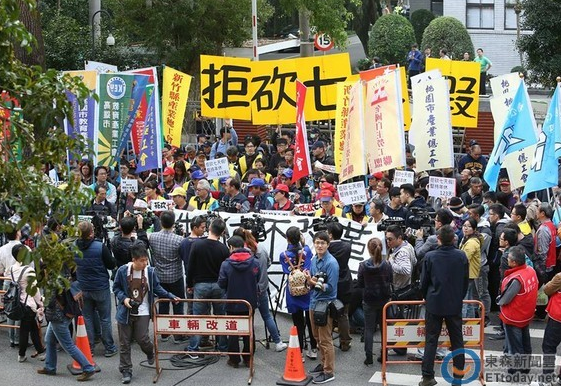 工斗等勞團在臺灣“立法院”外抗議一例一休。(圖/記者季相儒攝)圖片來源:臺灣“東森新聞網”