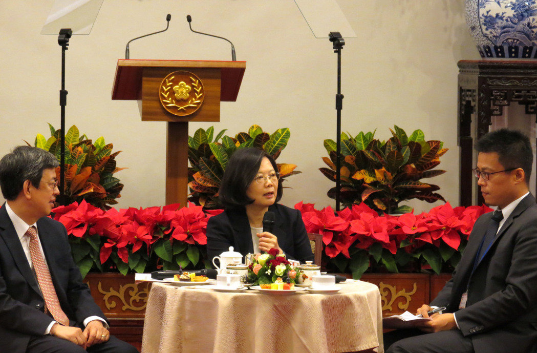 蔡英文(中)和副手陳建仁(左)31日在蔡辦內和媒體茶敘,蔡英文發表年終談話,并接受媒體提問。(圖片來源:臺灣“中央社”)