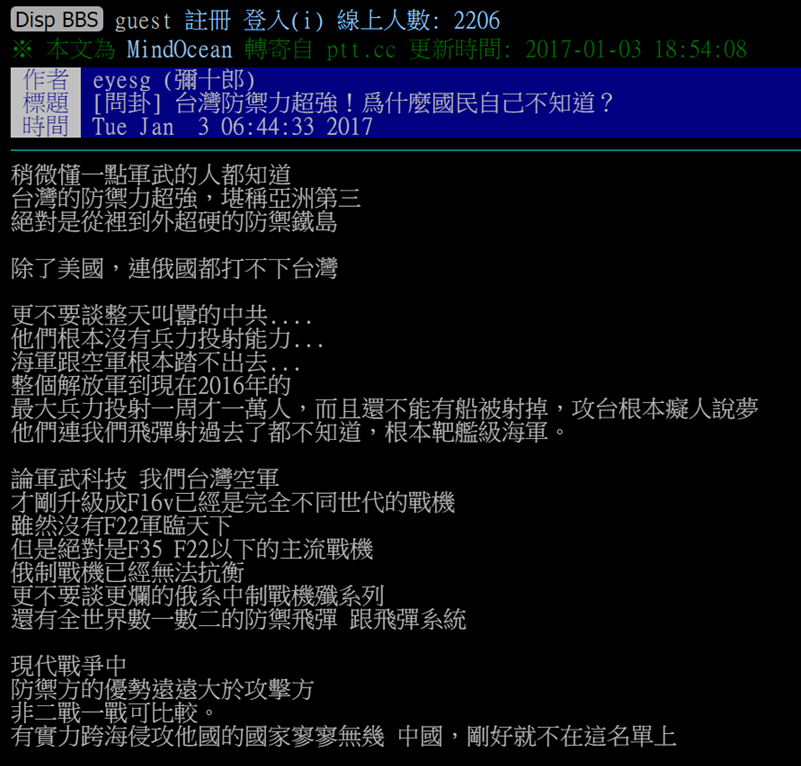 近日,臺灣社交媒體PTT(批踢踢實業坊)一篇名為“臺灣防御力超強!為什么國民自己不知道”的文章引起了島內網民的關注,文章里充斥著對臺島防御戰的自大情緒,稱“除了美國,連俄國都打不下臺灣”、“就算沒有美日支援,中國要吞下臺灣的代價,也是大到他們吃不下去。”而跟帖卻更多是在譏諷樓主:“鍵盤談兵”、“傻了才一味相信別人一定要為你做什么”。