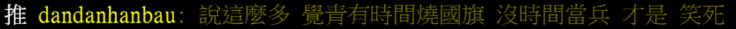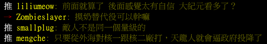 對于這篇文章的言之鑿鑿,臺灣網友更多是在嘲諷:“說這么多,覺青(臺灣網友對太陽花一代覺醒青年的戲稱)有時間燒國旗,沒時間參軍。”“先被斬首或者丟幾顆飛彈,就有人喊‘20FF’(直接投降)了,相信嗎?”“傻了才一味相信別人一定要為你做什么。”“根本不用打,只要封鎖臺灣海運,三個月臺灣自己垮了啊。”
