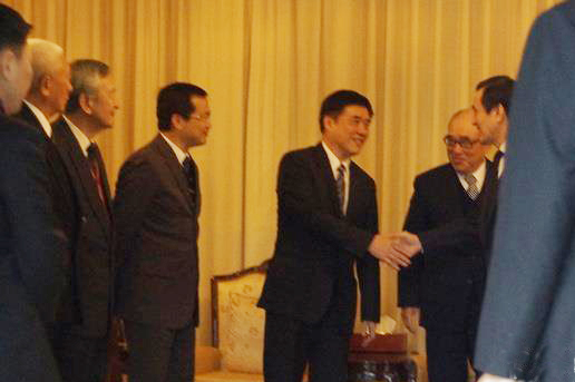 馬英九結束謁陵,走入廂房,與郝氏父子打招呼。(圖片來源:中評社)