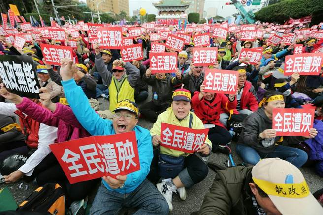 數(shù)萬抗議臺當(dāng)局年金改革群眾于農(nóng)歷春節(jié)前夕,云集到蔡辦門前的凱達(dá)格蘭大道,怒轟民進(jìn)黨當(dāng)局執(zhí)政無能,要蔡英文下臺。(圖片來源:臺灣《中時電子報》)