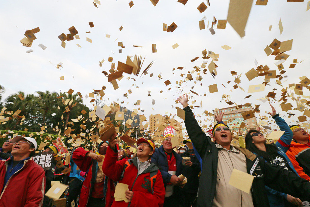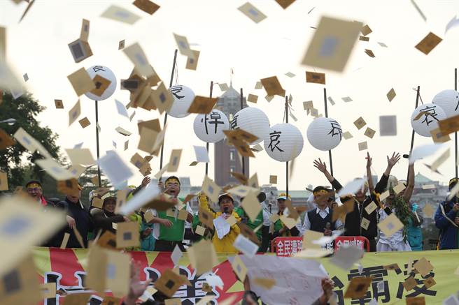 臺灣“軍公教勞”團體舉著白燈籠撒紙錢,為蔡英文當局“送終”。(圖片來源:臺灣《聯(lián)合報》)