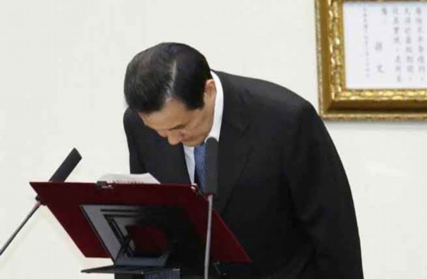2014年12月3日,國民黨九合一選舉慘敗,馬英九辭去國民黨黨主席職務,并鞠躬致歉。(圖片來源:臺“中時電子報”)