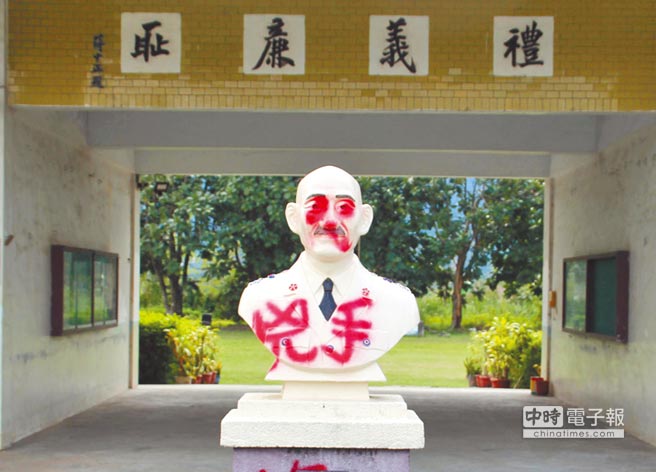 2017年3月1日,花蓮壽豐鄉(xiāng)吳全社區(qū)活動(dòng)中心將蔣公銅像雙眼、嘴角皆噴上紅漆。(圖片來(lái)源:臺(tái)灣《中時(shí)電子報(bào)》)