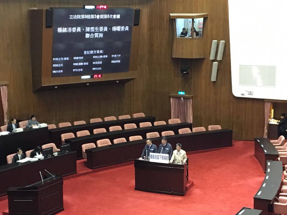 離島“立委”楊鎮浯、陳雪生、楊曜在“立法院”總質詢時,聯合質詢官員。