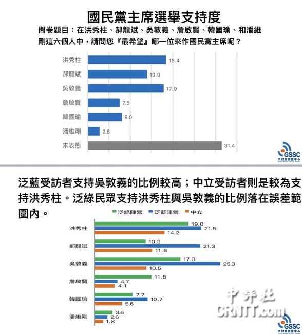 即將于2017年5月20日舉行的國民黨主席是由合格黨員投票,因此,全民調僅具參考價值。不過,該民調結果顯示,泛藍受訪者支持吳敦義比例較高,中立支持者較支持洪秀柱,泛綠民眾支持洪秀柱與吳敦義落在誤差范圍內,間接顯示吳占優勢。
