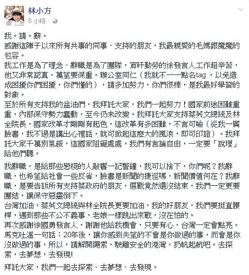 林育卉在文中還聲稱,自己辭職“是給那些戀棧的人敲響一記警鐘,我可以舍下,你們呢?我辭職,也希望給社會一些反省,臉書是新聞的捷徑嗎,新聞價值何在?我辭職,是要告訴所有支持蔡‘政府’的朋友,選戰竟然還沒結束,我們一定更要團結,讓保守惡靈倒下”。