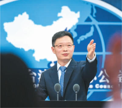國臺辦發言人安峰山在發布會上邀請記者提問。新華社記者 陳曄華攝