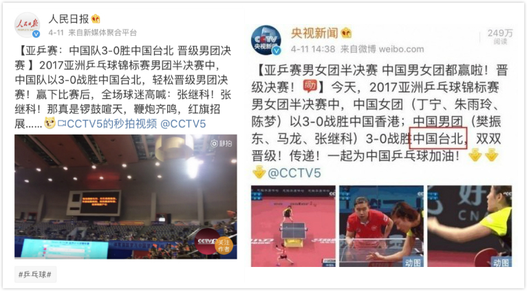 第23屆亞洲乒乓球賽在江蘇無錫舉行,有媒體發現,大陸央媒報道比賽時,將臺灣代表隊的名稱從原來的“中華臺北隊”改稱“中國臺北隊”。(來源:新浪微博)