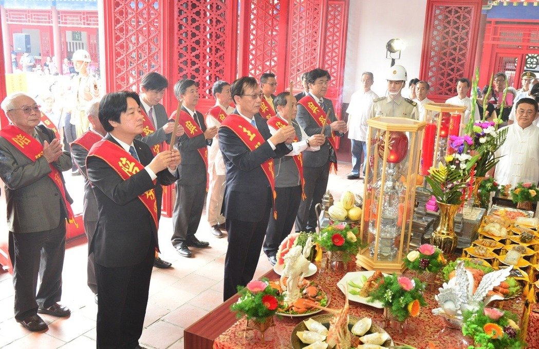 每年,臺南延平郡王祠都會舉辦鄭成功祭典,圖為2016年祭典由當時的臺“內政部長”陳威仁(前排左二)及臺南市長賴清德(前排左)主祭。(圖片來源:臺“聯合報”)