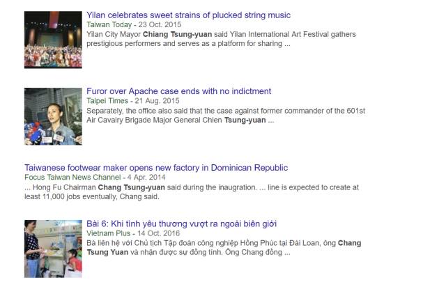 而且耿直哥可是通過搜索引擎搜索了半天呢。比如,當我把那位臺灣宜蘭市民進黨的市長江聰淵的英文名字“Chiang Tsung-Yuan”輸入后,搜索引擎給出的結果只有區區四個,而且最新的一個還是2016年的…