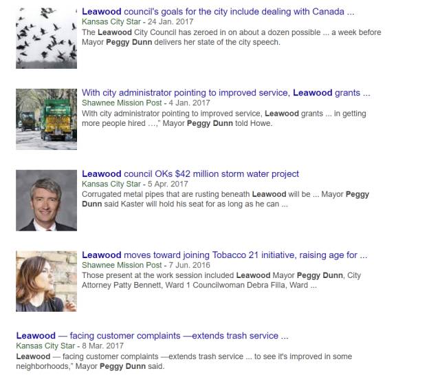 然后,我又把美國堪薩斯州黎霧市的名字Leawood和當地市長Peggy Dunn的名字輸入搜索引擎,可英文的搜索結果中同樣沒有任何與這次引發臺灣媒體高潮的“開球事件”相關的任何信息…