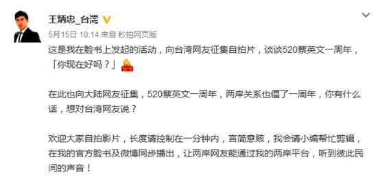 原來,這是臺灣新黨青年委員會委員王炳忠5月15日自己的微博和臉書同步發起了一項名為“你現在好嗎?”的視頻自拍征集活動,他“向臺灣網友征集自拍片,談談520蔡英文一周年。”