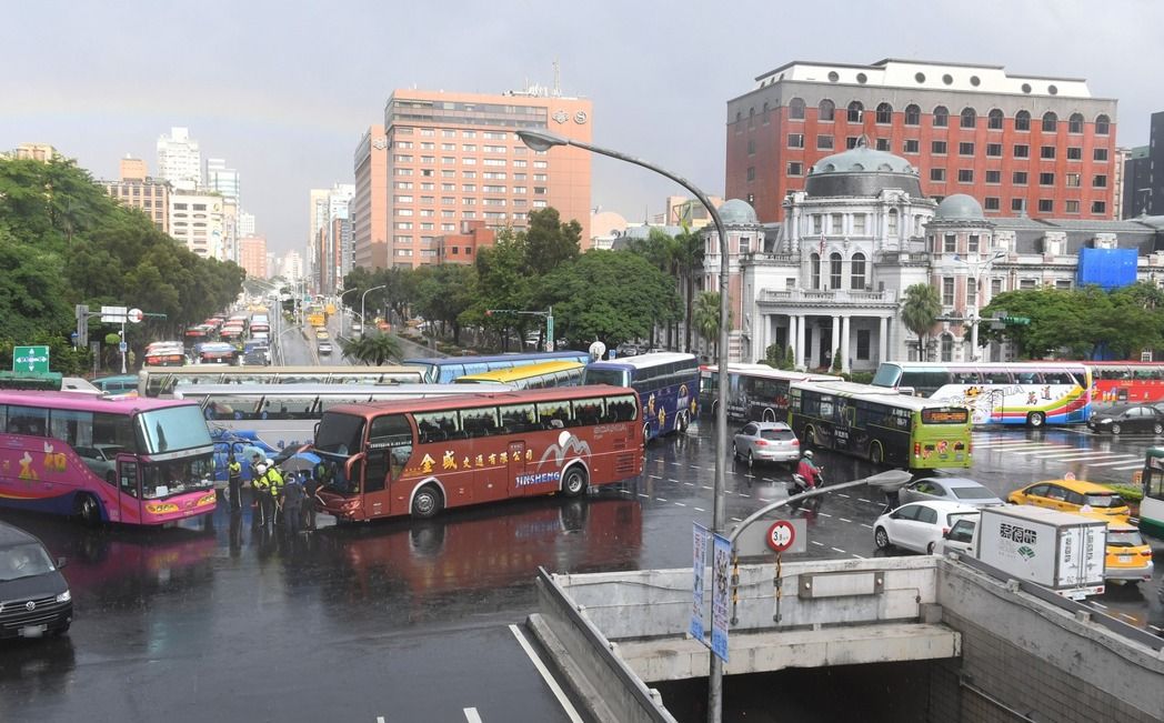 抗議的多輛游覽車擠在路口,一旁有拖吊車等待,不過游覽車的數量仍遠多于拖吊車。(圖片來源:臺媒)
