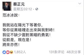 海外網7月10日電近日,中國國民黨政策會執行長蔡正元在社交媒體上轉發了范冰冰微博上的一段文字,引發熱議。原文為“我就站在陽光下等著你,等你從黑暗里走出來與我對峙!我從不缺少面對黑暗的勇氣!從前是,現在是!將來亦然!”