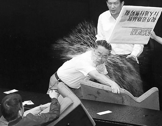 國(guó)民黨“立委”林為洲(左)丟出的水球砸中民進(jìn)黨“立委”吳秉叡(中)眉心。(圖片來自臺(tái)媒)