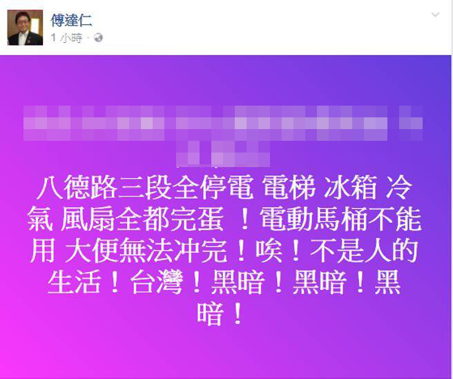 傅達(dá)仁借Facebook憤怒控訴停電給民眾帶來的不便。(網(wǎng)絡(luò)圖)