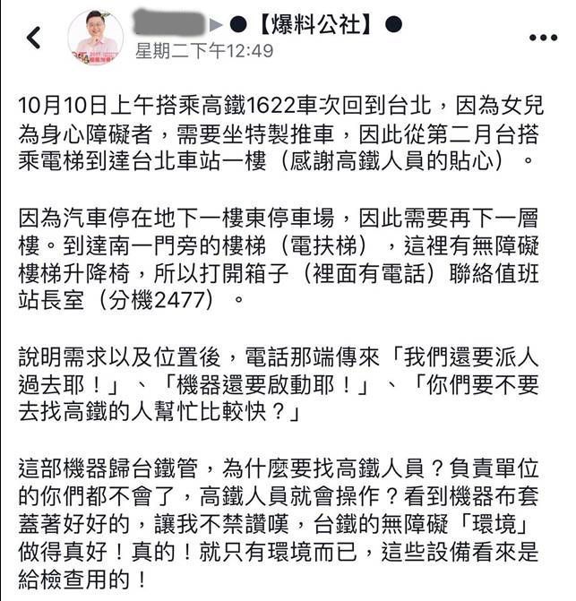 據(jù)臺(tái)灣“聯(lián)合新聞網(wǎng)”報(bào)道,一名網(wǎng)友在網(wǎng)上發(fā)文表示,自己的女兒是身心障礙者,移動(dòng)時(shí)需要特制推車的輔助。10號(hào)上午他與女兒搭乘臺(tái)灣高鐵抵達(dá)臺(tái)北車站,在高鐵服務(wù)員的幫助下到了臺(tái)北車站一樓,因?yàn)樾枰褂梦挥谂_(tái)鐵南一門旁的無障礙樓梯升降椅通往地下室,所以打電話聯(lián)絡(luò)值班站長室尋求幫助,沒想到對方卻以“還要派人過去啟動(dòng)機(jī)器很麻煩”推托,之后還向該名網(wǎng)友提議“要不要去找高鐵的人幫忙比較快?”