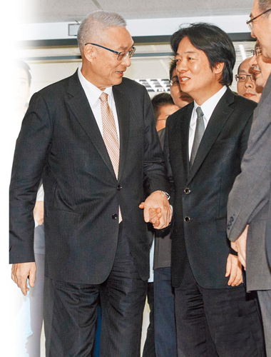 臺當局“行政院長”賴清德(右)3日拜會國民黨主席吳敦義(左),兩人在吳敦義辦公室外笑容滿面握手致意,隨后兩人手牽手步入會議室。(圖片來源:臺灣《中時電子報》)