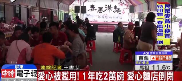 據(jù)報道,屏東市里長林群雄與親友集資250萬元(新臺幣,下同),于去年11月底開設(shè)“春風(fēng)滿面”,一碗面賣50元,若有弱勢人士需食則不收取費用,意在為貧困弱勢提供一餐溫飽,卻不料如此愛心竟被民眾濫用,比如有人天天上面館食用不付錢,還有人要求打包回家,店家不同意的話就在現(xiàn)場起爭執(zhí)。
