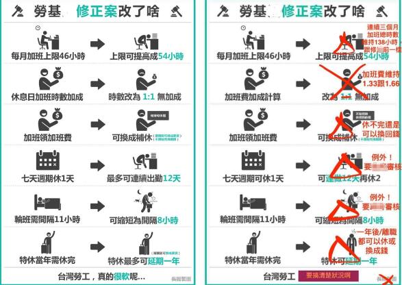臺灣物理治療師林長揚近日整理了“勞基法”修正案中被修改的內容,并制成圖表供網友閱覽,從現行規定到新修正案作出一系列的比較,列出了6大點,并提出雖然部分規定都強調可以“勞資協商”,“但你我都知道,臺灣大部分的勞資協商都是……臺灣勞工,真的很軟呢!期待‘勞動部’進一步函釋,與落實勞檢!”