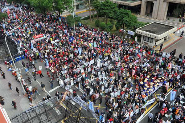 臺灣“立法院”臨時會,民進(jìn)黨挾人數(shù)優(yōu)勢,表決通過修正“農(nóng)田水利會組織通則”。圖為反對改制的各地水利會成員們齊聚在“立法院”外抗議,痛批當(dāng)局霸占人民財(cái)產(chǎn)。(圖片來源:臺灣《中時電子報(bào)》)