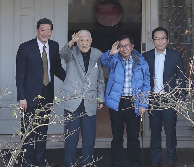 李登輝(左2)親自牽著阿扁(右2)至大門口,一起向守候的媒體揮手致意。(圖片來源:臺灣《中時電子報》)