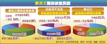 中國(guó)臺(tái)灣網(wǎng)1月29日訊 據(jù)臺(tái)灣《旺報(bào)》報(bào)道,臺(tái)灣民意基金會(huì)28日公布民調(diào)顯示,關(guān)于蔡英文在兩岸政策上的表現(xiàn),有3成1滿(mǎn)意、6成不滿(mǎn)意,不滿(mǎn)蔡英文兩岸政策表現(xiàn)的創(chuàng)下了自其上任以來(lái)不滿(mǎn)意比例的最高紀(jì)錄;而關(guān)于蔡當(dāng)局暫不批準(zhǔn)大陸東方航空、廈門(mén)航空春節(jié)加班機(jī)申請(qǐng)的行為,有近4成4的人不支持、4成的人支持,反對(duì)的人略多一些。