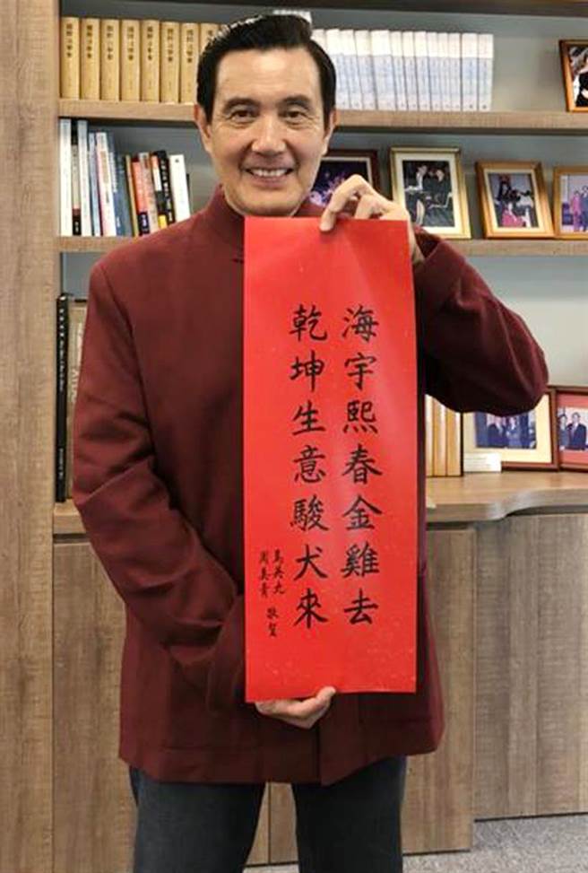 馬英九親筆狗年春聯(lián),“海宇熙春金雞去,乾坤生意駿犬來”,還有妻子周美青雙重祝福。(圖片來源:臺灣《中時電子報》)